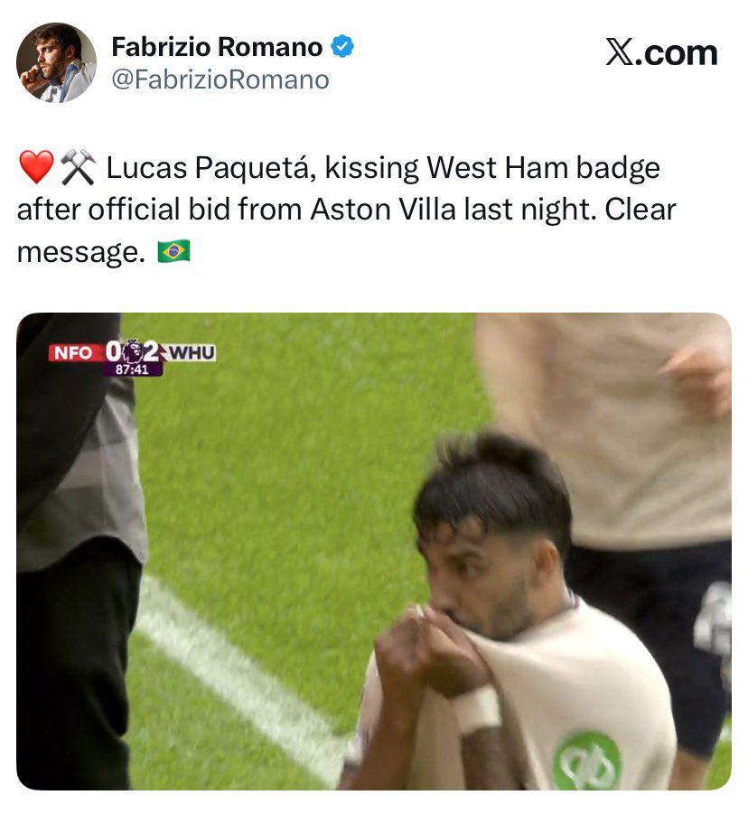 对此名记罗马诺写道:“帕奎塔亲吻了西汉姆的队徽,给出了明确的信号。昨晚,阿斯顿维拉已送上了正式的报价。”